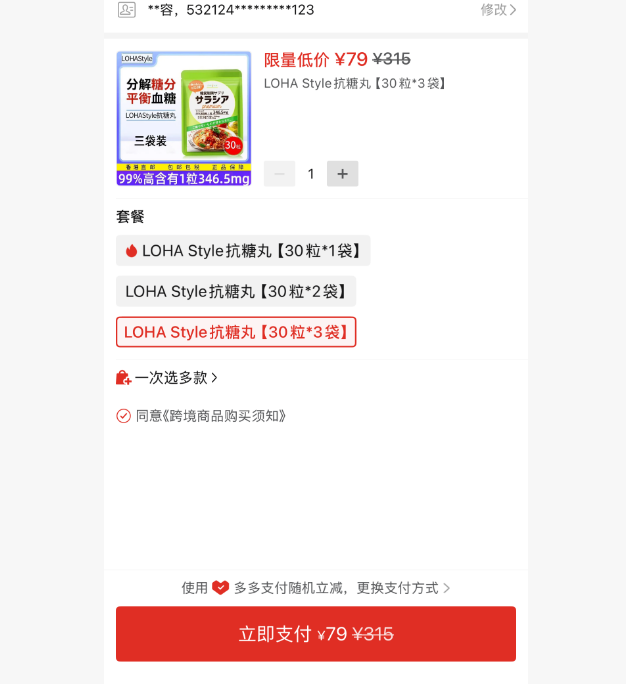 ① LOHA Style日本抗糖丸 30顆*3袋 79元https://mobile.yangkeduo.com/goods2.html?ps=uQ0wcVTYal